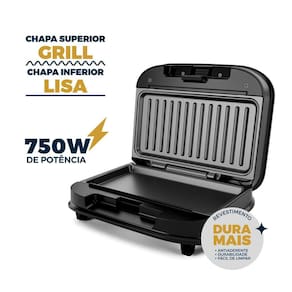 Com esse versátil eletrodoméstico, você pode preparar desde deliciosos sanduíches até grelhados suculentos, tudo em um só aparelho. O revestimento antiaderente Dura Mais facilita a limpeza e garante que seus alimentos não grudem, enquanto os 750W de potência garantem um cozimento rápido e uniforme.