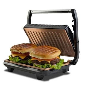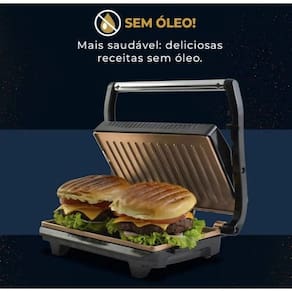Funciona como grill e sanduicheira, Faz dois sanduíches de uma vez, Placas com revestimento antiaderente na cor gold, Luz indicadora de aquecimentoTermostato regulável