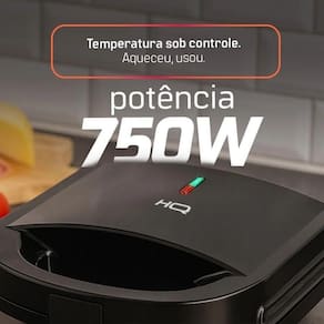Sanduicheira e Grill HQ 750W Antiaderente Preto 127V HQ-SG004A Sanduicheira e Grill HQ-SG004 oferece praticidade no preparo de sanduíches, grelhados leves e lanches rápidos. Compacta e eficiente, ela possui 750W de potência, chapas com acabamento grill e revestimento antiaderente, garantindo aquecimento uniforme e fácil limpeza. Ideal para cozinhas pequenas e rotinas dinâmicas, entrega segurança e estabilidade com trava de fechamento e base antiderrapante. O sistema de sinalização luminosa indica quando o aparelho está ligado e quando está pronto para uso.Principais Características750W de potência para aquecimento rápido e uniformeChapas com acabamento grill e revestimento antiaderenteSinalização luminosa com luz vermelha (ligado) e verde (pronto para uso)Trava de segurança e base estávelDesign compacto e leveControle automático de temperaturaConsumo consciente com materiais recicláveisEspecificações TécnicasCor: PretoPotência: 750WVoltagem: 127VRevestimento antiaderente: SimSinalização luminosa: SimTrava de segurança: SimBase antiderrapante: SimModelo: HQ-SG004