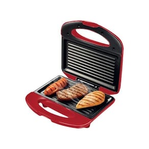 Sanduicheira e Grill Mondial Premium S-19 com potência de 800W, design em Vermelho/Inox, placas antiaderentes, base antiderrapante, alça fria e trava de segurança.Funciona como grill