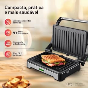 Sanduicheira e mini grill HQ 180º com 1000W de potência, chapas antiaderentes, alça com toque frio, base antiderrapante e controle automático de temperatura. Acabamento em aço inox.Funciona como grill