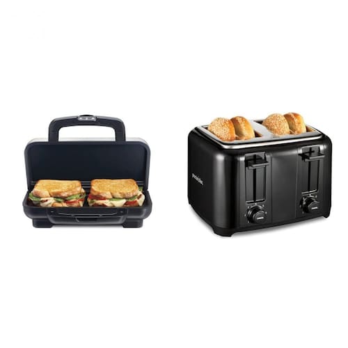 Sanduicheira com placas antiaderentes cerâmicas e tampa flutuante. Torradeira com 7 níveis de torra e função de elevação para itens menores. Ambas com corpo em aço inox e paredes de toque frio. Desligamento automático e botão cancelar na torradeira. Bandeja removível para migalhas na torradeira.Funciona como grill