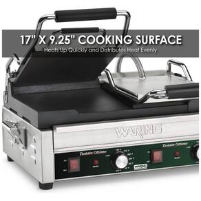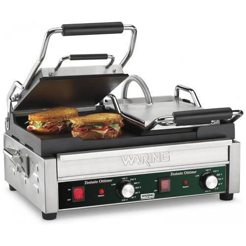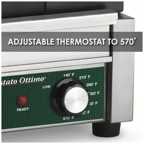 Grelha plana dupla italiana Ottimo e construída em material de aço inoxidável escovado com bandeja removível Sua superfície é ótima para sanduíches grelhados Panini, hambúrgueres, frango, legumes e muito mais Apresenta placas de ferro fundido planas versáteis, perfeitas para prensar ou grelhar Também possui luzes indicadoras de alimentação e pronto com alças resistentes ao calor Possui 240 volts AC, 3200 watts, alimentação de eres e classificação de plugue NEMA 6 20P aprovado pela certificação UL, cUL, NSF