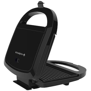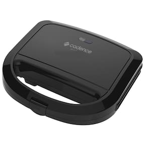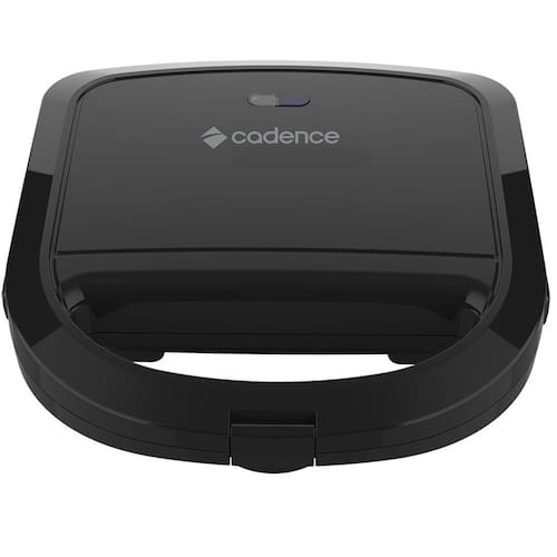 Sanduicheira elétrica Cadence preta com 750W de potência, alça isotérmica, trava de segurança, pés antiderrapantes e chapas antiaderentes.Funciona como grill