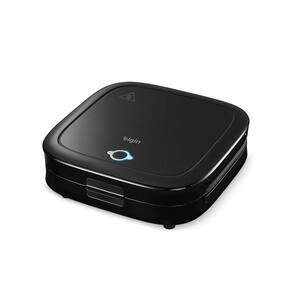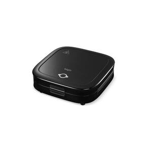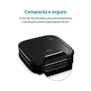 Sanduicheira elétrica com 800W de potência, chapas funda e ondulada com revestimento antiaderente, aquecimento duplo, trava de fechamento, luz indicadora de funcionamento, pés antiderrapantes e possibilidade de armazenamento vertical.Termostato regulável