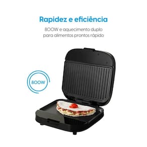 O Sistema de Aquecimento Duplo, com Uma Resistência para Cada Chapa, Garante Alimentos no Ponto Certo, de Maneira Rápida e Uniforme. Já o Revestimento Antiaderente Facilita a Limpeza e Prepara Pratos Mais Saudáveis, sem Precisar Usar Óleo.