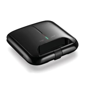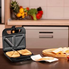 Sanduicheira retangular com placas antiaderentes que selam as bordas do sanduíche, potência de 800W, luz indicadora de ligado e pronto, alça fria, trava de segurança e pés antiderrapantes.Funciona como grill