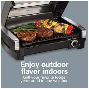 Traços em sucos e sabores Sele a 450 graus ou use o botão de temperatura ajustável para grelhar em fogo mais baixo e obter ótimos resultados. Desfrute de grelhados durante todo o ano este grelhador interior com capuz tem um alto calor abrasador que retém os sumos e sabores, e a tampa fecha para lhe dar as marcas exclusivas do grelhador. Serve até 6 pessoas com superfície grande para grelhar 76cm. Fique de olho nos seus alimentos este grelhador interno com cobertura vem com uma janela conveniente na tampa que permite que você observe os alimentos cozidos enquanto mantém o calor dentro. Fácil de limpar a cobertura da grade interna, a placa e a bandeja coletora extragrande são removíveis e podem ser lavadas na máquina de lavar louça. Menos bagunça a bandeja coletora extragrande coleta os sucos para que não derramem no balcão e pode ser lavada na máquina de lavar louça para facilitar a limpeza. Luzes de energia e pré aquecimento Elimine suposições ao usar sua churrasqueira elétrica. Cozinha mais do que bifes, churrascos e hambúrgueres grelhe frango, peixe, pizza, vegetais, frutas e muito mais. Também é bom para dietas paleo e ceto. Poderosos 1200 watts. Dimensões 32 x 41 x 17cm. Nome do estilo Searing Grill com janela Hamilton Beach Indoor Grill torna uma brisa saudável grelhados em casa. Ajuste de temperatura, pratos próprios para máquina de lavar louça e bandeja coletora O controle de temperatura ajustável varia de 200 graus a alta temperatura de queimadura de 450 graus