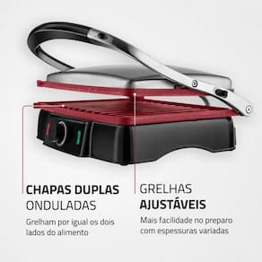 Sanduicheira e grill Mondial Press Grill 180° Red Ceramic com 2000W, abertura 180°, revestimento cerâmico antiaderente, grelhas duplas onduladas ajustáveis e seletor de temperatura.Funciona como grill