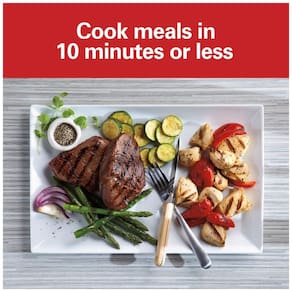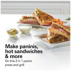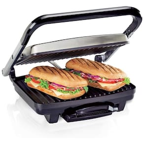 Sanduicheira Panini Hamilton Beach com placas antiaderentes, tampa articulada flutuante, ideal para sanduíches, carnes, legumes e frutas. Aquece uniformemente e possui aquecimento rápido.Funciona como grill