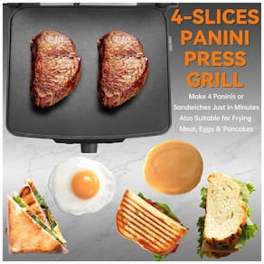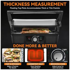 Corpo em aço inox com placas antiaderentes livres de BPA, PFOA e PTFE. Tecnologia de aquecimento pré-aquece rapidamente e mantém temperatura constante. Funcionalidades incluem modo manter aquecido, escova de limpeza e compatibilidade com pães finos ou ciabatta grossa. Indicada para refeições familiares ou preparos rápidos.Funciona como grill