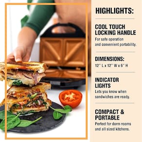 . SANDUÍCHES EM ALGUNS MINUTOS – Agora você pode desfrutar de um desempenho de alta qualidade com o simples de usar, fácil de limpar Gotham Steel Nonstick Sandwich Maker! FÁCIL DE USAR - faz quatro sanduíches de bolso perfeitamente torrados em menos de 5 minutos, comece a terminar Limpeza em SEGUNDOS - a superfície de cozimento ultra-antiaderente é reforçada com cerâmica e titânio para entregar a liberação final de alimentos. Não é necessário óleo ou manteiga, torna a alimentação mais saudável, e fornece para a limpeza sem problemas, 1-2-3 - basta limpá-los com um pano úmido uma vez que eles esfriaramINDICATOR LIGHTS - ele está pronto ainda? Não precisa perguntar! As luzes indicadoras da sanduicheira avisam quando os sanduíches estiverem prontos imediatamente! ALÇA DE TRAVAMENTO TOUCH COOL - alça de travamento de toque frio para operação segura e portabilidade conveniente. SANDUÍCHES PERFEITOS TODAS AS VEZES – brinda o pão e as focas com um recuo diagonal sem corte de alarde em meioCOMPACT &. PORTÁTIL – perfeito para dormitórios e cozinhas de todo o tamanho1 ANO – Gotham Steel é construída por anos de uso e apoiada por um ano limitado