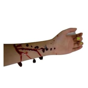 sangue teatral, para cinema, tv, artificial. Muito utilizado como complemento na criação dos efeitos de cortes, feridas, queimaduras etc. . . O sangue não deixa manchas, é de fácil remoção da pele, pode ser utilizado na boca uso externo e é hipoalergênico. Conteúdo: 500ml