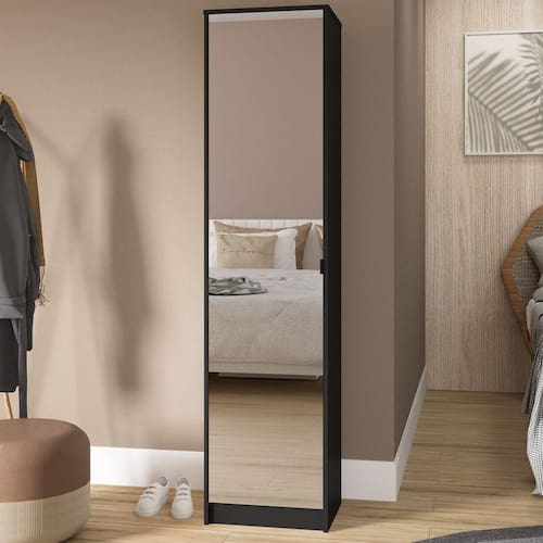 O(a) Sapateira 1 Porta com Espelho 6 Prateleiras Preto - Pnr Móveis é produzido em MDP na escala de brilho Fosco, e possui um grau de dificuldade de montagem: Médio.