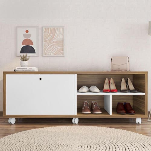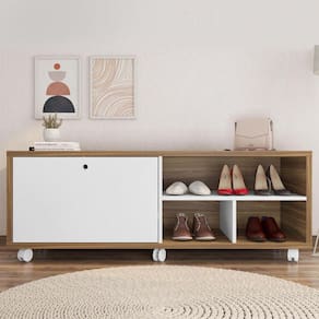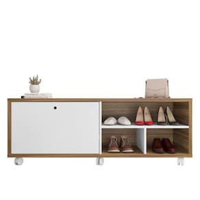 SAPATEIRA ESTILETO, A queridinha, pois é perfeita para compor o hall de entrada, o quarto ou mesmo o closet, a Sapateira Estileto é uma aliada e tanto na organização da casa. Oferecendo prateleiras para guardar os calçados do dia a dia, ela também conta com espaço de tampo, que pode receber mais calçados ou servir como apoio a outros itens de uso diário, como bolsas ou mochilas, com rodízio para fácil manuseio, é justamente essa versatilidade e o visual discreto que te permitem utilizá-la em diferentes cômodo, trazendo um ambiente moderno e facilitando na nossa rotina diária ! Acabamento da Porta: BP Acompanha Almofadas extras: Não Altura dos Pés: 5 cm Complexidade da Montagem: Média: pode ser montado por mais de uma pessoa e/ou necessite de maior conhecimento para montagem Cor: Mel/Branco Cor do Produto: Mel/Branco Estampado: Não Estofado: Não Itens Inclusos: 1 Sapateira, Kit ferragens e Manual de Montagem Manual de Montagem e Instalação: https://product-hub-prd.madeiramadeira.com.br/865798/documents/535a36e7-4666-4b3f-9109-0314ae50d9a292eqsapateiraestiloediCAoa.pdf Material da Estrutura: MDP Material da Porta: MDP Material do Puxador da Porta: MDP Material dos Pés: Plástico Necessita Montagem: Sim Origem do Produto: Nacional Peso: 38,7 kg Possui Baú: Não Possui Gavetas: Não Possui Percintas Elásticas: Não Possui Pés: 06 Possui Portas: 01 Possui Revestimento Interno: Não Possui Rodízio: Sim Recomendações de Uso, Manutenção e Limpeza: Limpar com pano macio levemente umedecido e em seguida pano macio seco. Não utilizar produtos abrasivos (lixas, esponjas) e/ou produtos a base de solventes (thinner, aguarrás). Rodízio com Trava: Sim Sistema de Montagem: Utiliza-se na montagem do produto sistema de fixação minifix, dobradiças, dispositivos angulares, cavilhas, parafusos, porcas cilindricas, entre outros; Suporta Até (kg): 28 kg Tipo de Dobradiça/Corrediça da Porta: Aço Ean: 7909903392119