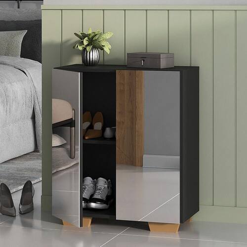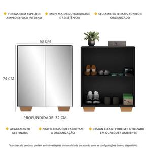 A Sapateira 2 Portas com Espelho Nina Multimóveis é produzida em MDP com acabamento acetinado (cerca de 20% de brilho), que garante maior durabilidade, facilidade na limpeza, além de um acabamento superior. Com 2 portas, possui um excelente espaço interno para acomodar seus sapatos e demais pertences (a prateleira interna suporta 8 Kg e o tampo 9 Kg). Os pés quadrados, em polipropileno, facilitam na hora da limpeza. Os espelhos na porta deixam o móvel mais requintado, criando um ambiente moderno e charmoso. Os espelhos são de vidro (o que evita que a imagem fique distorcida) e lapidados, ou seja, passam por um processo para que as bordas não fiquem cortantes, o que garante maior segurança. Compacta, é uma excelente opção para otimizar seu ambiente, para que você possa aproveitá-lo da melhor maneira possível.