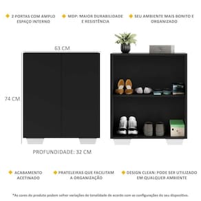 A Sapateira 2 Portas Nina Multimóveis é produzida em MDP com acabamento acetinado (cerca de 20% de brilho), que garante maior durabilidade, facilidade na limpeza, além de um acabamento superior. Com 2 portas, possui um excelente espaço interno para acomodar seus sapatos e demais pertences (a prateleira interna suporta 8 Kg e o tampo 9 Kg). Os pés quadrados, em polipropileno, facilitam na hora da limpeza. Compacta, é uma excelente opção para otimizar seu ambiente, para que você possa aproveitá-lo da melhor maneira possível.