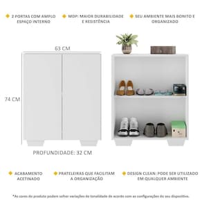 A Sapateira 2 Portas Nina Multimóveis é produzida em MDP com acabamento acetinado (cerca de 20% de brilho), que garante maior durabilidade, facilidade na limpeza, além de um acabamento superior. Com 2 portas, possui um excelente espaço interno para acomodar seus sapatos e demais pertences (a prateleira interna suporta 8 Kg e o tampo 9 Kg). Os pés quadrados, em polipropileno, facilitam na hora da limpeza. Compacta, é uma excelente opção para otimizar seu ambiente, para que você possa aproveitá-lo da melhor maneira possível.