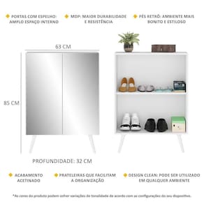 A Sapateira 2 Portas Retrô com Espelho Nina Multimóveis é produzida em MDP com acabamento acetinado (cerca de 20% de brilho), que garante maior durabilidade, facilidade na limpeza, além de um acabamento superior. Com 2 portas, possui um excelente espaço interno para acomodar seus sapatos e demais pertences (a prateleira interna suporta 8 Kg e o tampo 9 Kg). Os pés retrô, em polipropileno, dão um charme especial ao móvel deixando-o com um visual leve e permitindo você compor um ambiente com ar vintage e moderno ao mesmo tempo. Os espelhos nas portas deixam o móvel mais requintado, criando um ambiente moderno e charmoso. Os espelhos são de vidro (o que evita que a imagem fique distorcida) e lapidados, ou seja, passam por um processo para que as bordas não fiquem cortantes, o que garante maior segurança. Compacta, é uma excelente opção para otimizar seu ambiente, para que você possa aproveitá-lo da melhor maneira possível.
