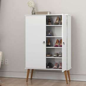 A Sapateira Spazio é o que falta em seu quarto! Extremamente elegante e funcional, ela possui o melhor do estilo retro. Possui duas portas com puxadores metálicos com designer colonial que agregaram muito charme ao produto. Internamente possui 4 prateleiras e suporta confortavelmente 15 pares de sapatos. Possui estrutura elaborada em MDP, e seus pés são feitos de madeira maciça. Cada pé de madeira possui um feltro protetor para garantir que o produto não risque o piso no qual for instalado. Todos esses atributos garantem à Sapateira Spazio maior resistência e durabilidade. Acabamento da Porta: Pintura UV Acabamento da Prateleira: Pintura UV Acabamento dos Pés: Verniz Altura dos Pés: 24 cm Ambiente Principal: Quarto Complexidade da Montagem: Baixa: pode ser montado por uma pessoa sozinha Cor: Branco Cor do Produto: Branco Cor Flex: Não Cor Interna: Branco Escala de Brilho: Brilhante Escala de Brilho da Porta: Brilhante Escala de Brilho da Prateleira: Brilhante Informações Complementares: Produto elaborado em MDP. A estrutura suporta até 30 Kg. Porta com dobradiças metálicas e puxadores metálicos com estilo colonial. Pés de madeira maciça (Pinus). Cada pé de madeira possui um feltro protetor. Itens Inclusos: 1 Sapateira Spazio; 1 Manual de Montagem. Linha ou Coleção: Versailles Manual de Montagem e Instalação: https://cdn2.madeiramadeira.com.br/atributo/patrimar-moveis/468533-manual-de-montagem-sapateria-spazio.pdf Material da Porta: MDP Material da Prateleira: MDP Material do Puxador da Porta: Metal Material dos Pés: Madeira Maciça Material Principal: MDP Montagem Flex: Não Necessita Montagem: Sim Origem do Produto: Nacional Pés Reguláveis: Não Peso: 37,64 kg Peso Máximo por Prateleira: 6 kg Possui Espelho: Não Possui Pés: 04 Possui Portas: 02 Possui Prateleiras: 04 Possui Rodízio: Não Recomendações de Uso, Manutenção e Limpeza: A limpeza do móvel deve ser efetuada somente com pano macio e seco. Não utilizar produtos abrasivos ou similares. Sapatas Niveladoras: Não Sistema de Montagem: Parafusos, minifix, cavilhas, cola e pregos. Suporta Até (kg): 30 kg Tamanho: Tipo de Dobradiça/Corrediça da Porta: Metálica Tipo de Madeira Maciça dos Pés: Pinus Tipo de Porta: Bater Tipo de Puxador da Porta: Externo Ean: 7898599073269