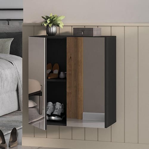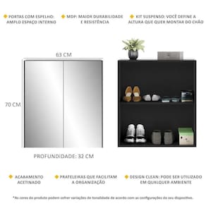 A Sapateira 2 Portas Suspensa com Espelho Nina Multimóveis é produzida em MDP com acabamento acetinado (cerca de 20% de brilho), que garante maior durabilidade, facilidade na limpeza, além de um acabamento superior. Com 2 portas, possui um excelente espaço interno para acomodar seus sapatos e demais pertences (a prateleira interna suporta 8 Kg e o tampo 9 Kg) e ainda acompanha kit para ser montada de forma suspensa, conforme a altura que você quiser do chão. Os espelhos nas portas deixam o móvel mais requintado, criando um ambiente moderno e charmoso. Os espelhos são de vidro (o que evita que a imagem fique distorcida) e lapidados, ou seja, passam por um processo para que as bordas não fiquem cortantes, o que garante maior segurança. Compacta, é uma excelente opção para otimizar seu ambiente, para que você possa aproveitá-lo da melhor maneira possível.