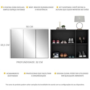 Conteúdo da Embalagem: 1 (uma) sapateira 1 (um) kit com suporte para sapateira 1 (um) kit com 3 espelhos