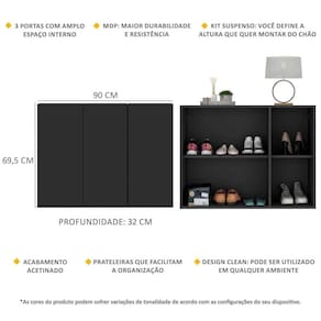 A Sapateira 3 Portas Suspensa Nina Multimóveis é produzida em MDP com acabamento acetinado (cerca de 20% de brilho), que garante maior durabilidade, facilidade na limpeza, além de um acabamento superior. Com 3 portas, possui um excelente espaço interno para acomodar seus sapatos e demais pertences (as prateleiras internas suportam 2 e 5 Kg e o tampo 7 Kg) e ainda acompanha kit para ser montada de forma suspensa, conforme a altura que você quiser do chão. Compacta, é uma excelente opção para otimizar seu ambiente, para que você possa aproveitá-lo da melhor maneira possível.