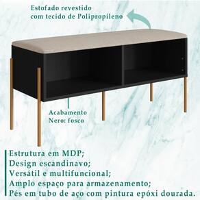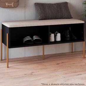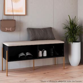 Sapateira Banco 93 CM Com Pés Em Metal Oslo 28968, possui estética escandinava, cores sóbrias e aconchegantes, juntamente com charme e elegância. Tem duas funções: sapateira, possibilita uma melhor organização para armazenar os calçados e como banco possibilita sentar-se enquanto calça ou descalça os mesmos. Produzido em MDP de 15mm com acabamento BP, conta com assento estofado revestido com tecido de polipropileno e pés de tubo metálico em aço com ponteiras plásticas para evitar atrito do móvel com o piso. Sua capacidade de peso suportado é de 106 Kg, sendo: 100 Kg no assento e 3 kg em cada nicho. Traz como característica um traço artesanal, minimalista e acolhedor, remete em suas linhas retas a simplicidade e funcionalidade que sua casa merece. Este produto chegará em sua casa separado em 02 volumes.