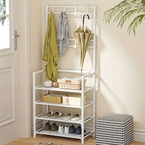 Organização completa em um só produto (cabideiro + sapateira + ganchos superiores).