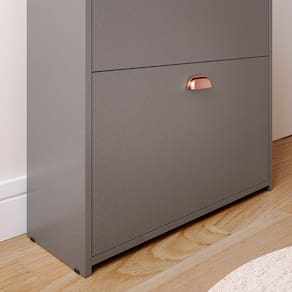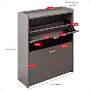 Fabricada em MDP de alta qualidade, oferece resistência e durabilidade. Conta com duas gavetas basculantes com prateleiras, ideais para armazenar até 12 pares de calçados, mantendo tudo organizado e harmonioso.