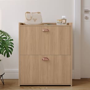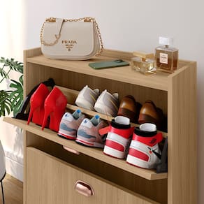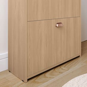 Fabricada em MDP de alta qualidade, oferece resistência e durabilidade. Conta com duas gavetas basculantes com prateleiras, ideais para armazenar até 12 pares de calçados, mantendo tudo organizado e harmonioso.