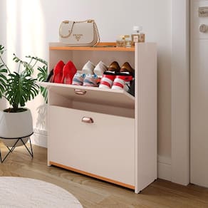 Fabricada em MDP de alta qualidade, oferece resistência e durabilidade. Conta com duas gavetas basculantes com prateleiras, ideais para armazenar até 12 pares de calçados, mantendo tudo organizado e harmonioso.