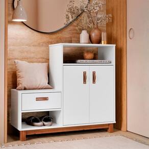 Com estrutura em MDP/MDF de 15mm, oferece 3 portas com dobradiças metálicas, 1 prateleira interna e pés em madeira maciça que garantem resistência e estilo.