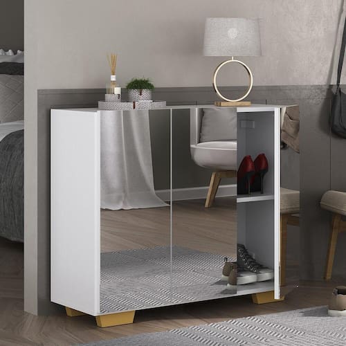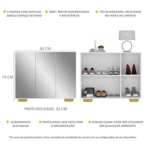 A Sapateira com Espelho 3 Portas Nina Multimóveis é produzida em MDP com acabamento acetinado (cerca de 20% de brilho), que garante maior durabilidade, facilidade na limpeza, além de um acabamento superior. Com 3 portas, possui um excelente espaço interno para acomodar seus sapatos e demais pertences (as prateleiras internas suportam 2 e 5 Kg e o tampo 7 Kg). Os pés quadrados, em polipropileno, facilitam na hora da limpeza. Os espelhos na porta deixam o móvel mais requintado, criando um ambiente moderno e charmoso. Os espelhos são de vidro (o que evita que a imagem fique distorcida) e lapidados, ou seja, passam por um processo para que as bordas não fiquem cortantes, o que garante maior segurança. Compacta, é uma excelente opção para otimizar seu ambiente, para que você possa aproveitá-lo da melhor maneira possível.