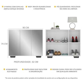 Dimensões do produto montado: Altura: 74cm | Largura: 90cm | Profundidade: 32cm *Você pode consultar as medidas internas na imagem técnica do produto.