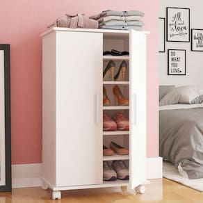 Características: Sapateira Marca: BRV Móveis Modelo: 07- BRV Estrutura: MDP 15mm Tipo de Acabamento: BP Produto Suporta até: 26kg Acomoda até: 18 Pares de Sapatos Quantidade de Portas: 02 Quantidade de Prateleiras: 05 Peso Suportado por Prateleiras: 5kg Tipo de Dobradiça: Baixa/Calço01/Caneco26 Material da Dobradiça: Aço Cromado Quantidade de Pés: 04 Tipo dos Pés: Rodizio 40mm Material dos Pés: Polipropileno Quantidade de Puxadores: 02 Tipo de Puxador: 180mm Material do Puxador: Madeira Pintado