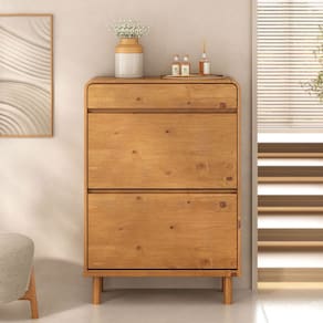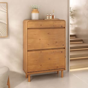 A Sapateira de Madeira Maciça Basculantes 18 Pares Vertical Nael foi desenvolvida para quem busca aliar design, segurança e organização em um só móvel. Seu formato curvo e sofisticado transforma qualquer ambiente, além de trazer um diferencial importante para o dia a dia: ao ser posicionada em cômodos abertos, os cantos arredondados proporcionam mais fluidez visual e maior segurança, evitando acidentes especialmente em casas com crianças.