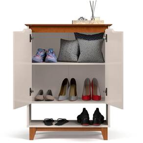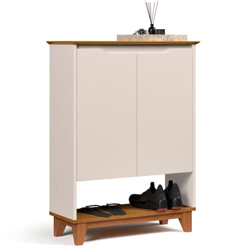 Sapateira Hall Flow Off White Com Freijo Com estilo moderno e linhas suaves, a Sapateira Hall Flow é a escolha ideal para quem deseja manter o ambiente de entrada organizado com elegância e design clean e proporções bem definidas tornam a peça perfeita para compor halls, corredores ou áreas de circulação com sofisticação e leveza tampo e as portas são fabricados em MDF usinado, com acabamento refinado que valoriza os detalhes e reforça a estética contínua e puxadores externos, o visual da frente é uniforme e minimalista, destacando o design contemporâneo do mó estrutura dos pés em madeira maciça proporciona firmeza, durabilidade e um toque natural ao diferencial, o modelo acompanha régua dupla face, um recurso funcional que permite a passagem e organização de cabos ideais para quem deseja utilizar a sapateira também como apoio multifuncional no ambiente.Internamente, oferece amplo espaço para armazenamento de calçados, acessórios ou itens de uso cotidiano, unindo praticidade à estética leve e ões:Altura: 90,5 cmLargura: 68 cmProfundidade: 26,5 cmObservações:- Design sem puxadores aparentes, com visual limpo e contemporâneo - Tampo e portas em MDF usinado, com acabamento sofisticado - Estrutura dos pés em madeira maciça, com excelente resistência - Régua dupla face inclusa: mais organização e versatilidade - Amplo espaço interno para calçados, acessórios e objetos diversos