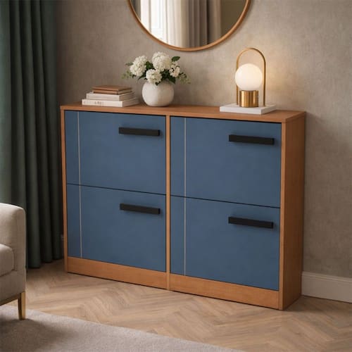 O(a) Sapateira Lisboa 4 Portas Azul/Freijó - Politorno é produzido em MDP na escala de brilho Semi-Fosco, e possui um grau de dificuldade de montagem: Médio.