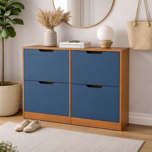 O(a) Sapateira Madri 4 Portas Azul/Freijó - Politorno é produzido em MDP na escala de brilho Semi-Fosco, e possui um grau de dificuldade de montagem: Médio.