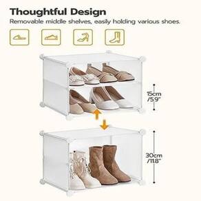 Características Principais: Design Elegante: A cor branca elegante e neutra adiciona um toque de brilho e elegância a qualquer ambiente, combinando facilmente com diversos estilos de decoração. Grande Capacidade de Armazenamento: Com 8 cubos espaçosos, cada um dividido em 2 camadas por uma prateleira intermediária removível, esta sapateira oferece amplo espaço para sapatos, roupas, brinquedos infantis e muito mais.