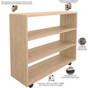 Características: Estrutura 100% em MDP 15mm. Fitas com borda de papel. Revestimento melamínico 100% em BP, que garante maior resistência ao produto. 04 rodízios de PVC para fácil locomoção. Suporta até 20Kg. Altura de 16 cm entre as prateleiras. Produto na Cor Amadeirado, com acabamento Fosco.