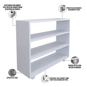 Características: Estrutura 100% em MDP 15mm. Fitas com borda de papel. Revestimento melamínico 100% em BP, que garante maior resistência ao produto. 04 rodízios de PVC para fácil locomoção. Suporta até 20Kg. Altura de 16 cm entre as prateleiras. Produto na Cor Branco, com acabamento Fosco.