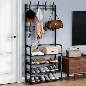 - Estrutura Robusta e Durável: Fabricada em ferro de alta qualidade, a estrutura metálica oferece grande resistência e durabilidade, suportando o peso dos objetos armazenados. O design combina o cabideiro para roupas e o suporte para sapatos de forma funcional e eficiente.