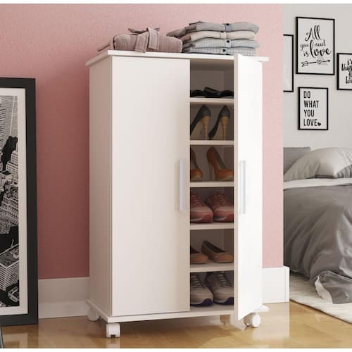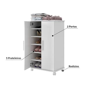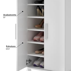 Características - Branco - Estrutura: MDP - Acabamento: BP - 02 portas - 05 Prateleiras interna - Rodízios - Para 18 pares de calçados - Peso máximo suportado: 15kg - Objetos não acompanham esse produto, mas são vendidos separadamente. Imagem meramente ilustrativa.