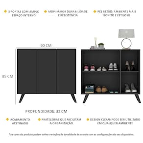 A Sapateira Retrô 3 Portas Nina Multimóveis é produzida em MDP com acabamento acetinado (cerca de 20% de brilho), que garante maior durabilidade, facilidade na limpeza, além de um acabamento superior. Com 3 portas, possui um excelente espaço interno para acomodar seus sapatos e demais pertences (as prateleiras internas suportam 2 e 5 Kg e o tampo 7 Kg). Os pés retrô, em polipropileno, dão um charme especial ao móvel deixando-o com um visual leve e permitindo você compor um ambiente com ar vintage e moderno ao mesmo tempo. Compacta, é uma excelente opção para otimizar seu ambiente, para que você possa aproveitá-lo da melhor maneira possível.