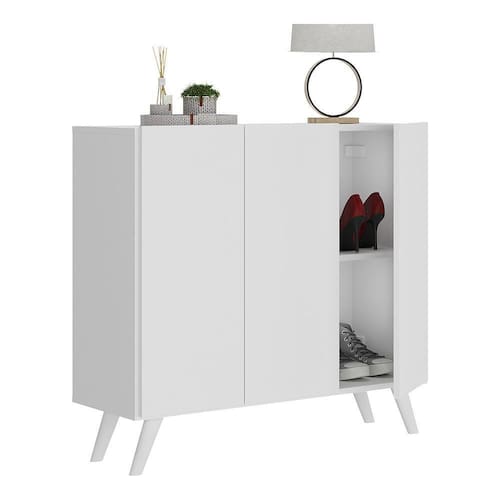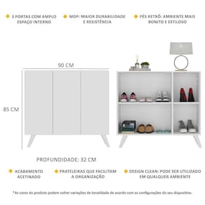 A Sapateira Retrô 3 Portas Nina Multimóveis é produzida em MDP com acabamento acetinado (cerca de 20% de brilho), que garante maior durabilidade, facilidade na limpeza, além de um acabamento superior. Com 3 portas, possui um excelente espaço interno para acomodar seus sapatos e demais pertences (as prateleiras internas suportam 2 e 5 Kg e o tampo 7 Kg). Os pés retrô, em polipropileno, dão um charme especial ao móvel deixando-o com um visual leve e permitindo você compor um ambiente com ar vintage e moderno ao mesmo tempo. Compacta, é uma excelente opção para otimizar seu ambiente, para que você possa aproveitá-lo da melhor maneira possível.