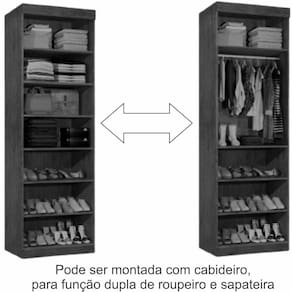 Estrutura: MDPAcabamento: Pintura U.VPorta: Sim, 01 porta de abrir, com dobradiças metálicas com espelhoPrateleira: Sim, 07 Prateleiras interno fixa, Suporta ate 3 KG cada prateleiraCabideiro: Sim, acompanha o produto em alumínioPuxador: Sim, em MDF revestidoPeso suportado: Suporta o peso total 18 KGExtra: Pode ser montada com cabideiro para função dupla de roupeiro e sapateiraDimensões do produto montado