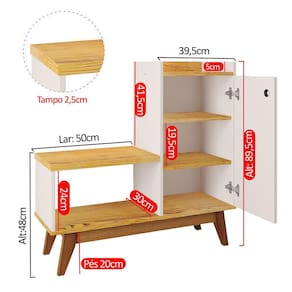 Ela também conta com um assento que possibilita calçar seus sapatos de forma confortável. Abaixo do assento foi inserido um nicho, podendo ser utilizado para acomodar calçados ou itens decorativos.