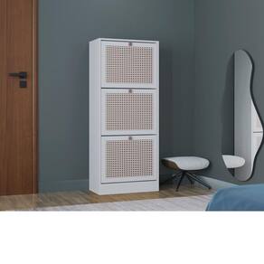 Sapateira Tropical 3 Portas Branco Sapateira Tropical 3 Portas - Organizacao e Estilo para Seus Sapatos Material: Estrutura em BP (Laminado decorativo de baixa pressao), oferecendo resistencia superior a riscos, umidade e manchas. Portas com pintura 3D que imita a palha indiana, proporcionando um toque elegante e diferenciado